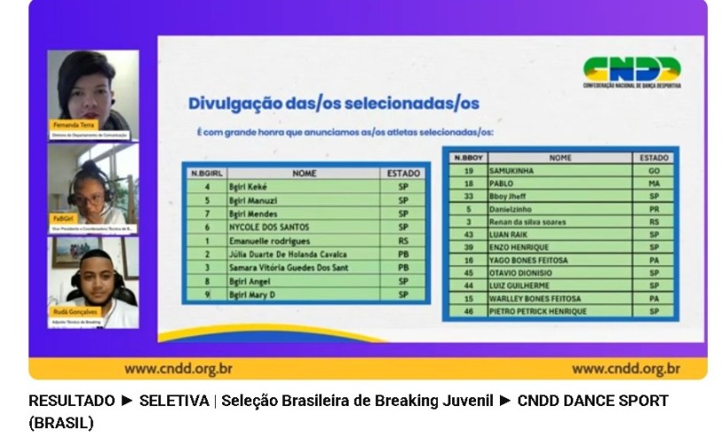 O anúncio foi realizado em uma live transmitida na quinta-feira, 10 de julho, às 17h, conduzida por Fabiana Balduína (FabGirl), vice-presidente da CNDD e coordenadora técnica do departamento de Breaking; Rudá Gonçalves Rocha, coordenador técnico adjunto; e Fer Terra (B-girl CWBreaking), diretora do Departamento de Comunicação. Estiveram presentes na transmissão representantes de federações, familiares e atletas de diversas regiões do Brasil, todos ansiosos pelo comunicado oficial dos(as) jovens atletas selecionados(as).